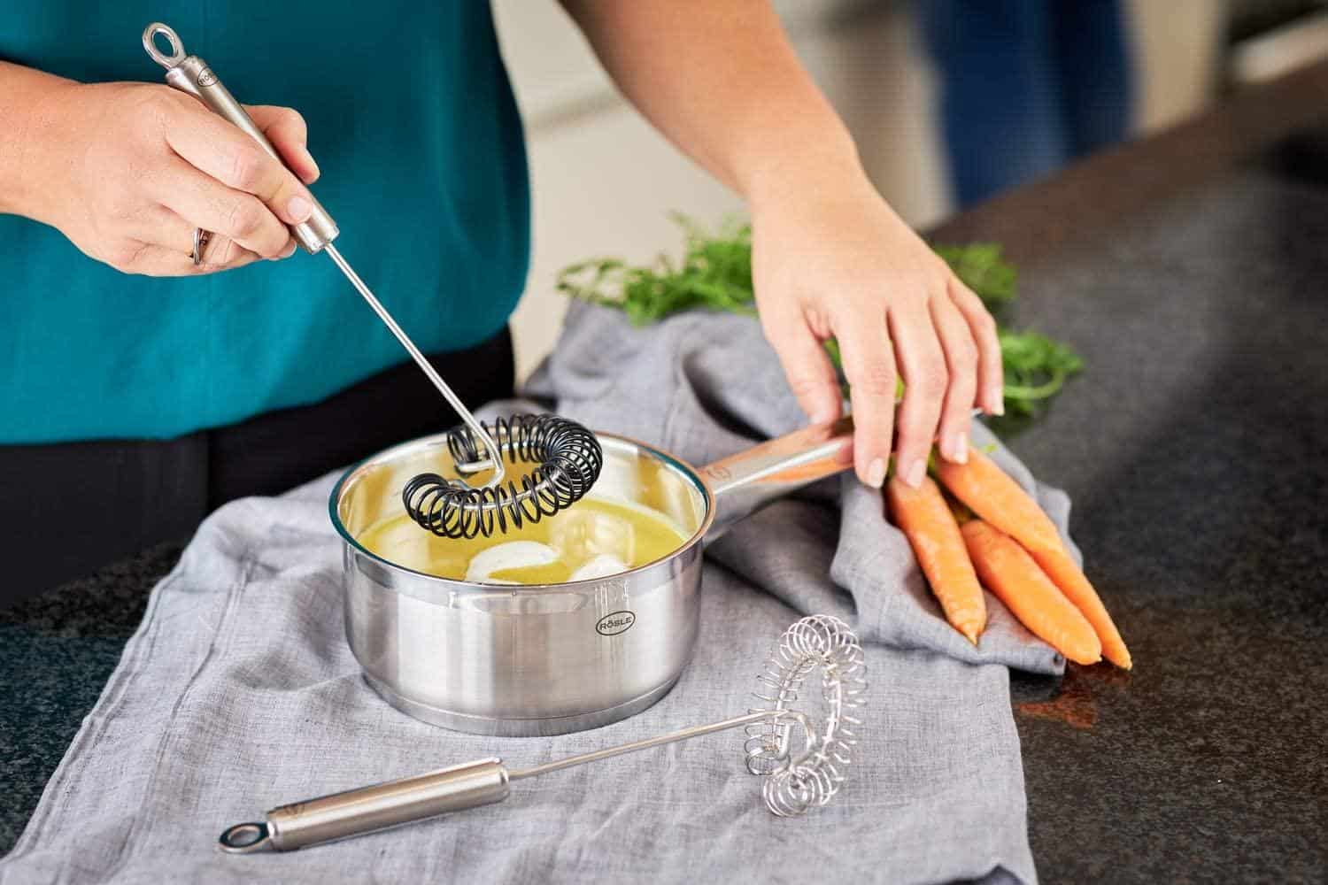Phới tạo bọt Silicon Roesle 95545 an toàn với máy rửa bát và có thể chịu được nhiệt độ lên đến 220°C/428 °F và không tương tác với chất béo, dầu và axit vì vậy lý tưởng để đánh bông thực phẩm dạng lỏng như súp và nước sốt, kem và bánh kếp. Quá trình vệ sinh cũng nhẹ nhàng và chế biến món ăn đều rất an toàn và dễ dàng.
