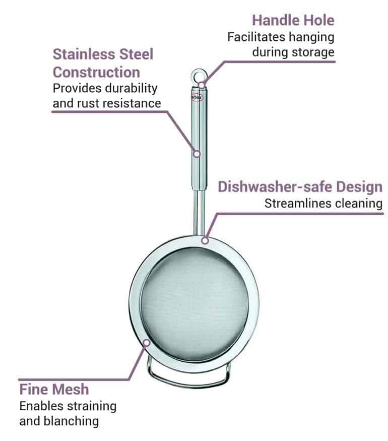 Lịch sử của thương hiệu Roesle gắn với những câu chuyện của những phát minh sáng tạo. Những phát minh giúp nâng cao trải nghiệm trong căn bếp của những đầu bếp chuyên nghiệp cũng như các đầu bếp tại gia. Chính vì điều này, thương hiệu này đã nhận được sự yêu mến của người tiêu dùng trong suốt hơn 125 năm qua. Rây lọc Roesle 95264 được làm bằng chất liệu thép không gỉ 18/10 và có lưới thép ổn định về kích thước.