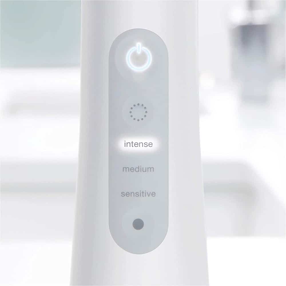 - Tăm Nước Oral-B Aquacare 6 Type 3726 cũng được trang bị các chế độ để giúp bảo vệ nướu khỏi bị ảnh hưởng của các tia nước áp lực cao. Có 3 chế độ cho phép chúng ta chọn lựa là INTENSE cho việc sử dụng thường ngày, chế độ MEDIUM mức trung bình và SENSITIVE khi hàm răng trở nên nhạy cảm – chế độ này sẽ tạo ra các bọt khí với áp lực nhẹ hơn so với các chế độ khác giúp làm sạch các mảng bám nhưng không gây hại cho nướu.