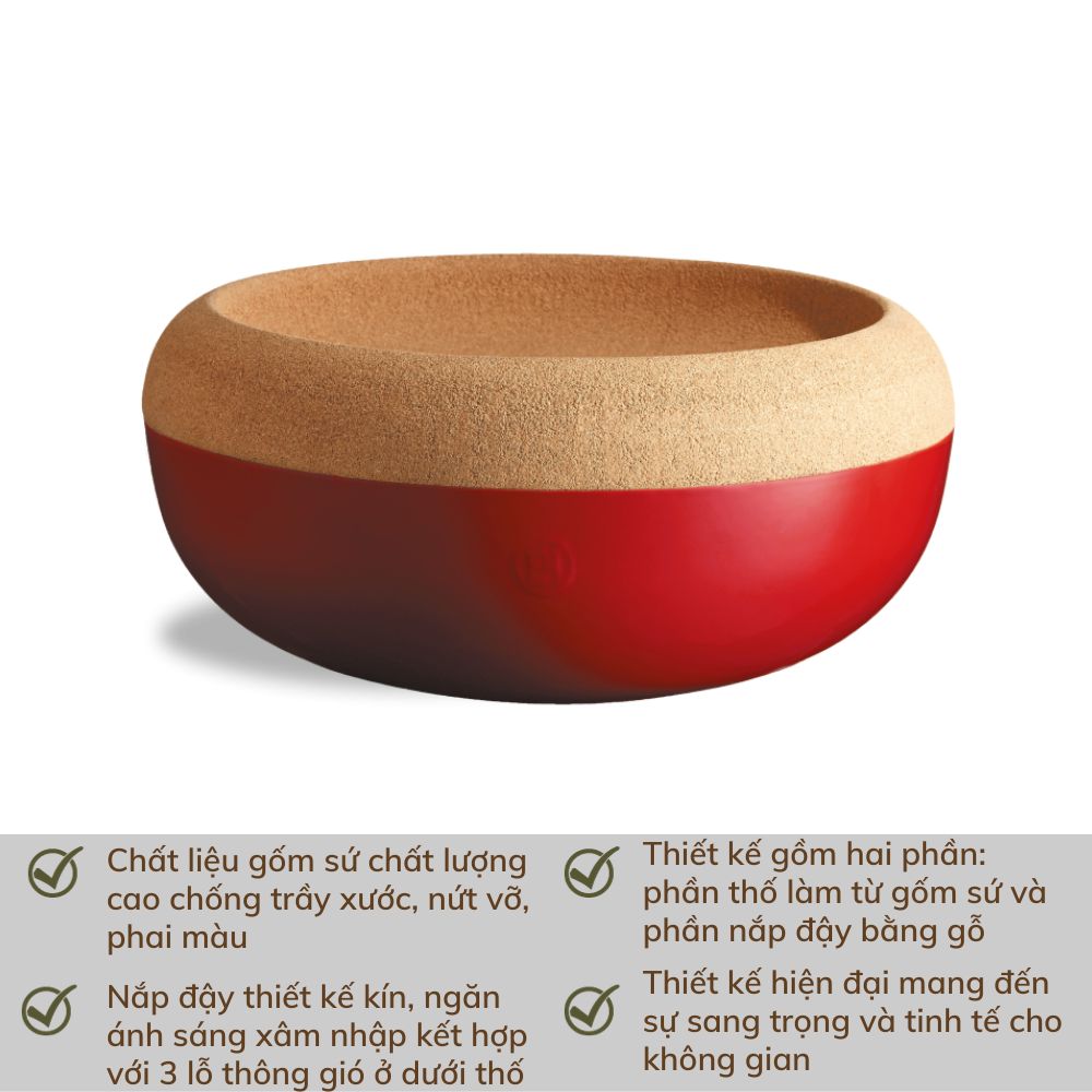 Thố Bảo Quản Emile Henry EH348765 hoạt động ở 2 tầng. Nắp đậy bằng gỗ, đóng vai trò như một tô hoa quả, mang lại một vẻ đẹp tinh tế, trong khi phần đáy bằng gốm cung cấp không gian để bảo quản hành, củ cải hoặc khoai tây tươi mát và nằm ngoài tầm nhìn. Phần nắp của thố có thể bảo quản ngay cả những loại trái cây dễ hỏng nhất, đảm bảo rằng chúng ít bị hư hỏng hơn ở điểm tiếp xúc. Đặc biệt, nắp thố còn giúp đuổi ruồi giấm và hấp thụ độ ẩm mà trái cây có thể tiết ra.