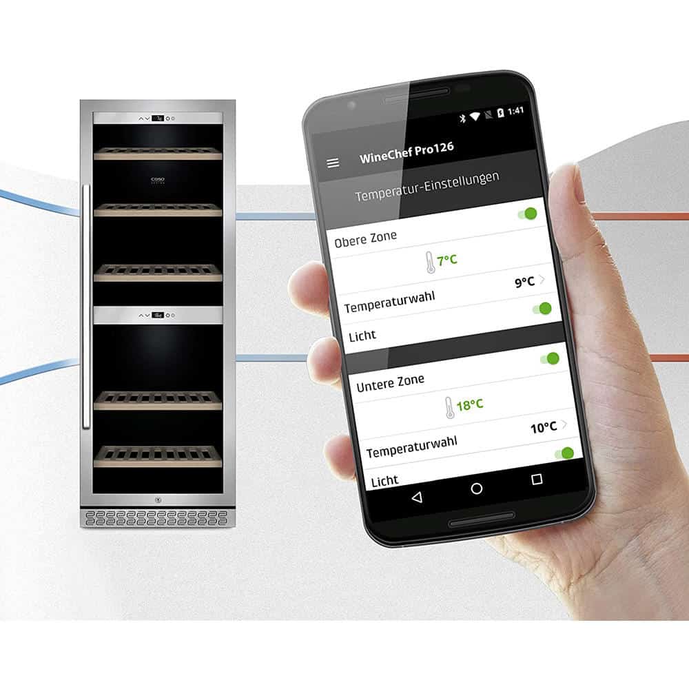 Tủ Bảo Quản Rượu Vang Caso WineChef Pro 126-2D với hai vùng nhiệt độ được điều chỉnh riêng biệt. Do đó lý tưởng để lưu trữ rượu vang trắng và đỏ cùng một lúc, chẳng hạn như rượu sủi tăm, nước chanh hoặc nước cũng có thể được lưu trữ trong tủ rượu Caso WineChef Pro 126-2D 2 tầng cao cấp. Khu vực phía trên dành để lưu trữ rượu vang trắng và rượu vang sủi bọt (6-10 ° C), khu vực phía dưới dành cho rượu vang đỏ (12-18 ° C.).