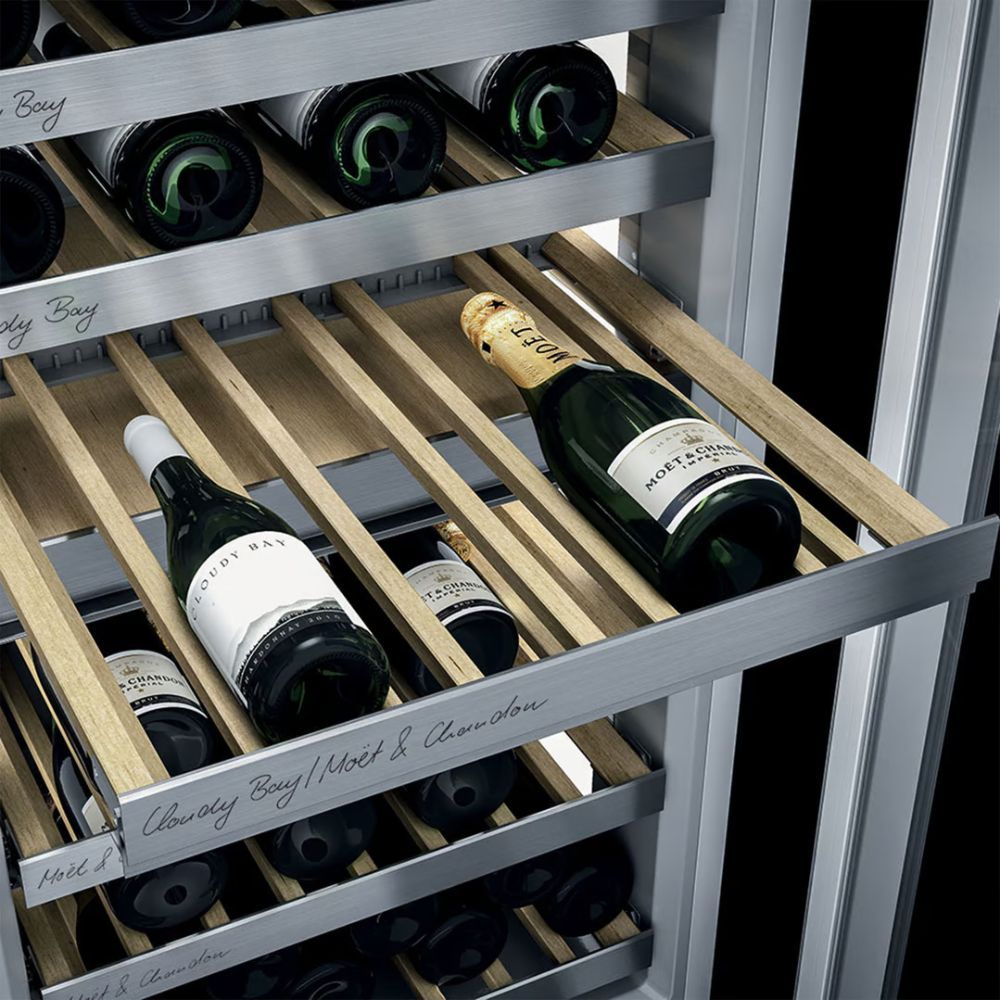 Việc kéo các kệ bảo quản trong tủ bảo quản rượu vang Liebherr EWT 9175 Monolith trở nên dễ dàng hơn bao giờ hết nhờ vào hệ thống ray kéo Telescopic. Hơn nữa, bạn cũng có thể điều chỉnh các kệ gỗ để phù hợp với kích thước khác nhau của các chai rượu, từ rượu vang đến rượu sâm panh hay rượu vang đỏ Coup De Foudre Pinot noir. Nhờ thiết kế này, bạn có thể tận dụng tối đa không gian trong tủ rượu của mình.