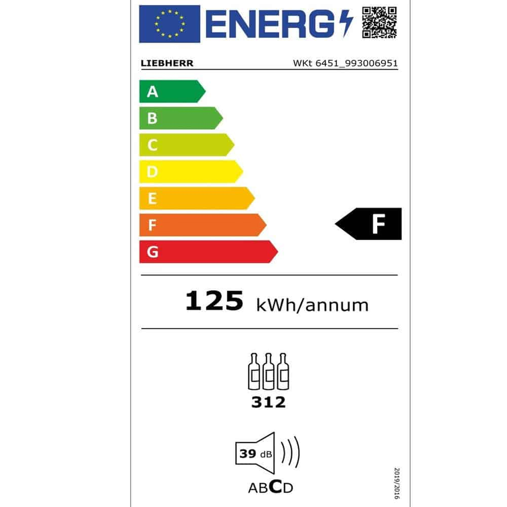 Tủ bảo quản rượu vang Liebherr WKt 6451 GrandCru được thiết kế với công nghệ tiết kiệm điện với nhãn năng lượng F. Mặc dù nhãn năng lượng F, tủ vẫn có mức tiêu thụ điện khá thấp, chỉ khoảng 0,391 kWh mỗi ngày. Điều này cho thấy sự tối ưu hóa trong việc vận hành của tủ, giúp tiết kiệm năng lượng mà không làm giảm hiệu quả bảo quản rượu vang.