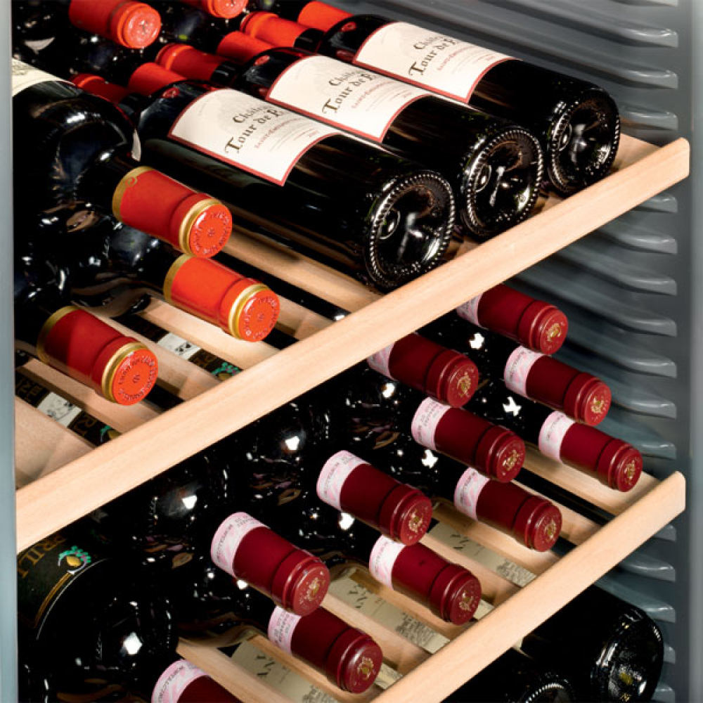 Tủ bảo quản rượu vang Liebherr WKt 6451 GrandCru được trang bị hệ thống 7 khay kệ, trong đó có 6 kệ làm từ gỗ dẻ gai cao cấp. Gỗ dẻ gai không chỉ tạo nên vẻ đẹp tự nhiên và sang trọng mà còn có độ bền cao, giúp bảo vệ nhãn chai khỏi trầy xước khi sắp xếp hoặc lấy rượu.