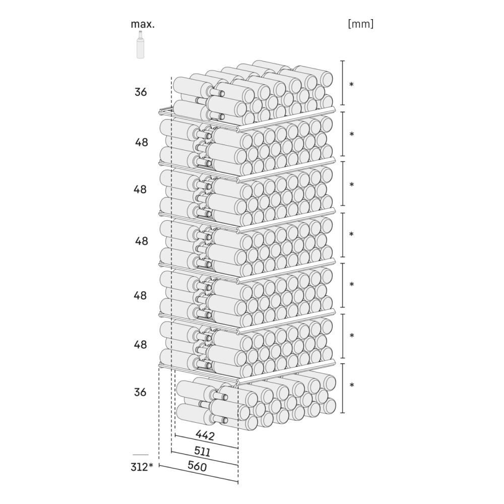 Tủ có dung tích lớn 625 lít có thể bảo quản lên tới 312 chai Bordeaux tối đa 0,75 lít, mang lại không gian lưu trữ rộng rãi nhưng vẫn giữ được sự tinh tế.