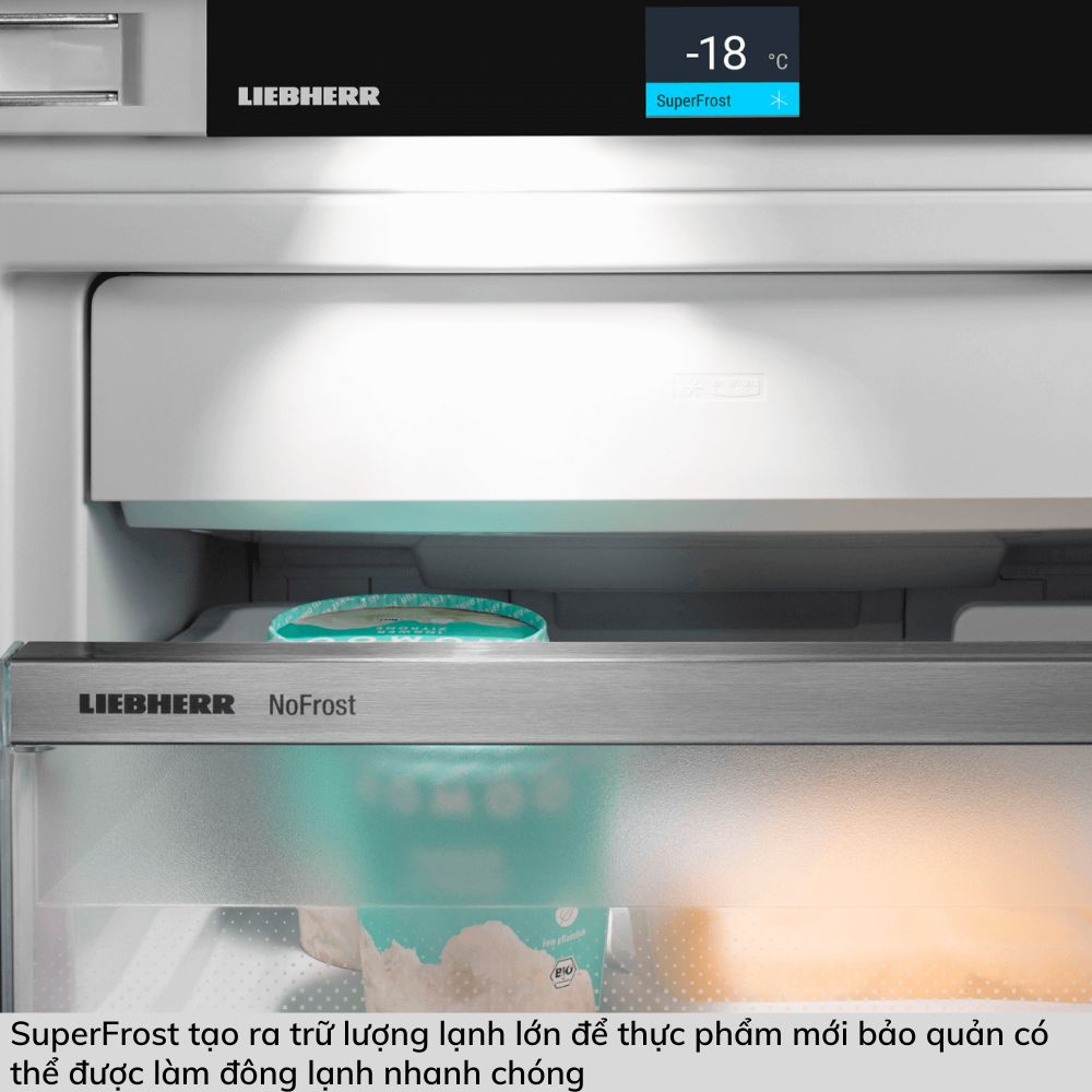 Tủ đông Liebherr SIFNe 5188 cũng tích hợp công nghệ NoFrost, giúp loại bỏ hiện tượng tạo đọng sương và đóng băng trong tủ. Điều này giữ cho không gian bên trong luôn khô ráo và sạch sẽ, giúp bảo quản thực phẩm một cách hiệu quả hơn và tiết kiệm công sức trong việc bảo dưỡng tủ.
