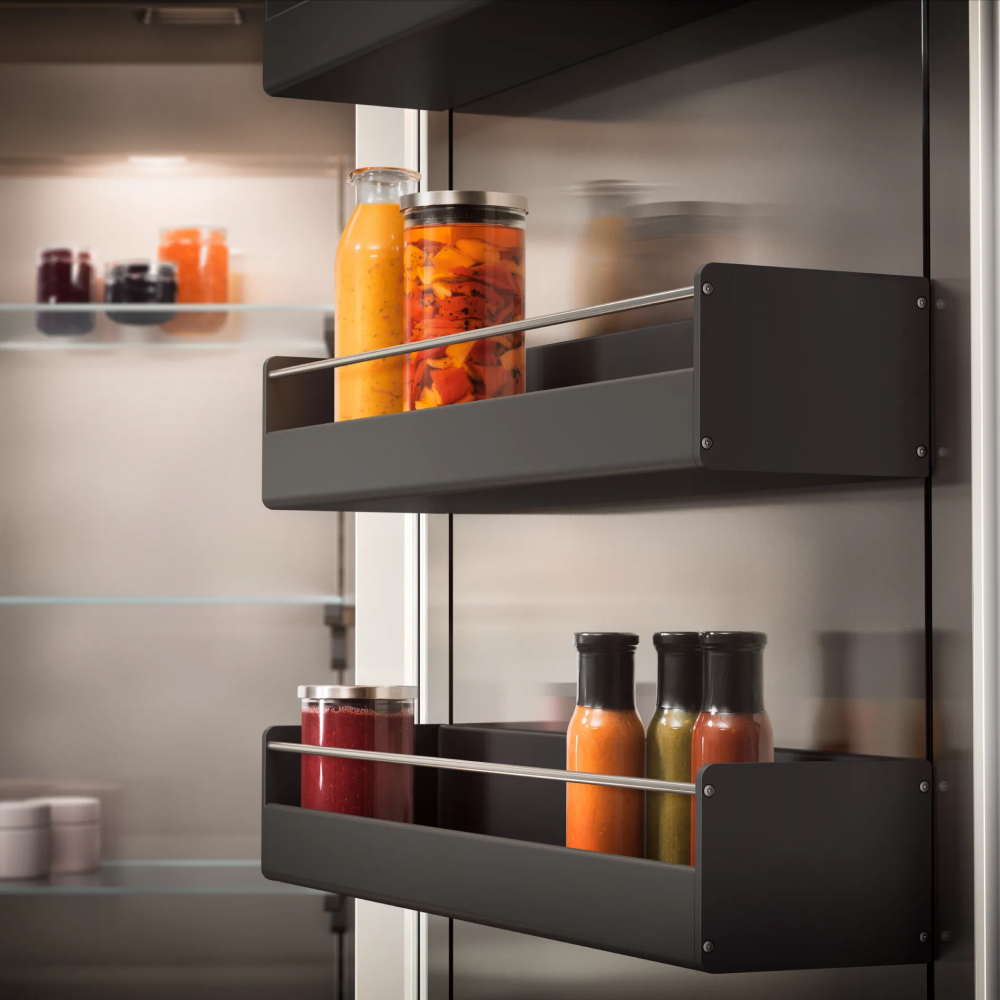 Tủ lạnh Gaggenau ở mặt trong của cánh cửa được trang bị 4 kệ có thể tùy chỉnh được độ cao tùy theo yêu cầu của người dùng.