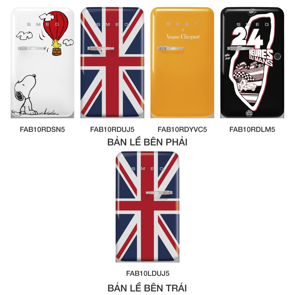 Tủ lạnh mini Smeg 122 lít FAB10 phiên bản đặc biệt mang biểu tượng của phong cách retro sang trọng lấy cảm hứng thiết kế từ những năm thập niên 50, tích hợp ngăn đông và ngăn lạnh 2 trong 1. Thiết bị với 2 phiên bản bản lề cánh cửa trái hoặc phải, gồm các màu sắc tương ứng như: