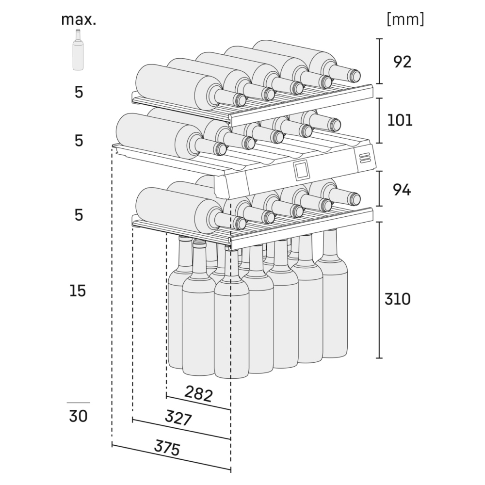 | Tổng dung tích tủ | 97 lít – 30 chai rượu (0,75 lít) |