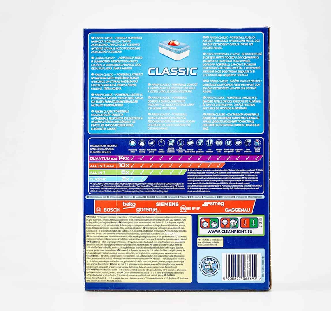 - Bước 1 – Làm sạch: Viên rửa bát bát Finish Powerball Classic chứa các thành phần hoạt tính cao giúp loại bỏ ngay cả các vết bẩn cứng đầu nhất một cách nhanh chóng và triệt để, có khả năng làm sạch tuyệt vời.