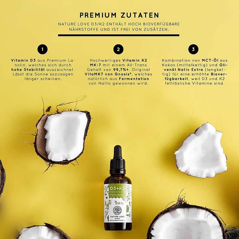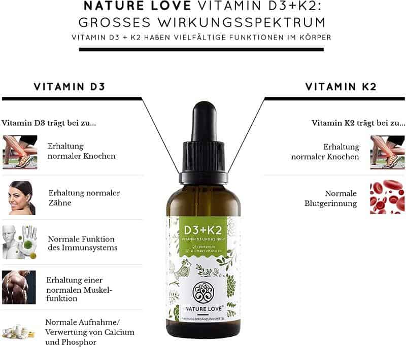 Vitamin D3 + K2 Nature Love đến từ Đức có vai trò cung cấp Vitamin D3 (cholecalciferol-D3) – một loại vitamin tan trong chất béo giúp cơ thể hấp thụ canxi và phốt pho. Theo nhiều nghiên cứu, đảm bảo đầy đủ lượng vitamin D, canxi và phốt pho có vai trò rất quan trọng để xây dựng và giữ cho xương chắc khỏe. Ngoài ra, Vitamin D được sử dụng để điều trị và ngăn ngừa các rối loạn xương (như còi xương, nhuyễn xương), tuy nhiên với lối sống ít vận động, học tập và ngồi trong văn phòng nhiều giờ liền khiến cơ thể của nhiều người Việt Nam hiện đại ngày càng bị thiếu hụt VItamin D3
