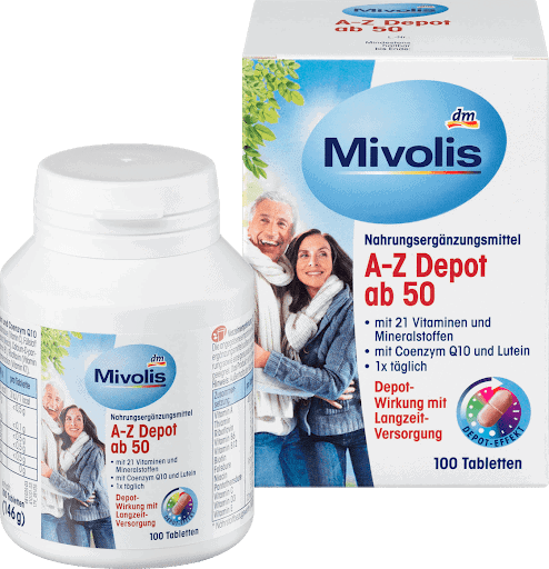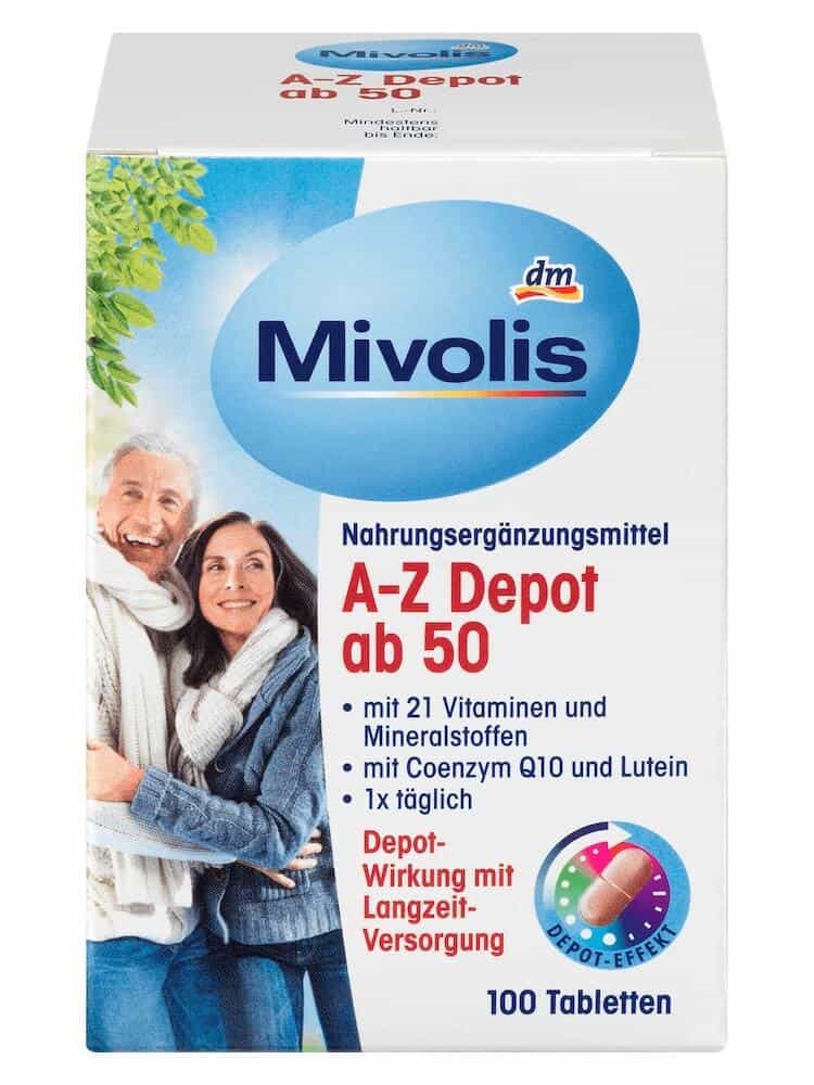 VITAMIN TỔNG HỢP CHO NGƯỜI GIÀ TRÊN 50 TUỔI MIVOLIS A-Z Depot ab 50, Tabletten là giải pháp chăm sóc sức khỏe hiệu quả của Đức dành riêng cho người trên 50 tuổi. Bổ sung hơn 20 vitamin khoáng chất giúp cơ thể khỏe mạnh, hạn chế mệt mỏi, căng thẳng …A Z Depot ab 50 còn có công dụng làm đẹp từ bên trong. Giúp bạn có một cơ thể khỏe mạnh, làn da sáng đẹp, ngừa nám và khô da.